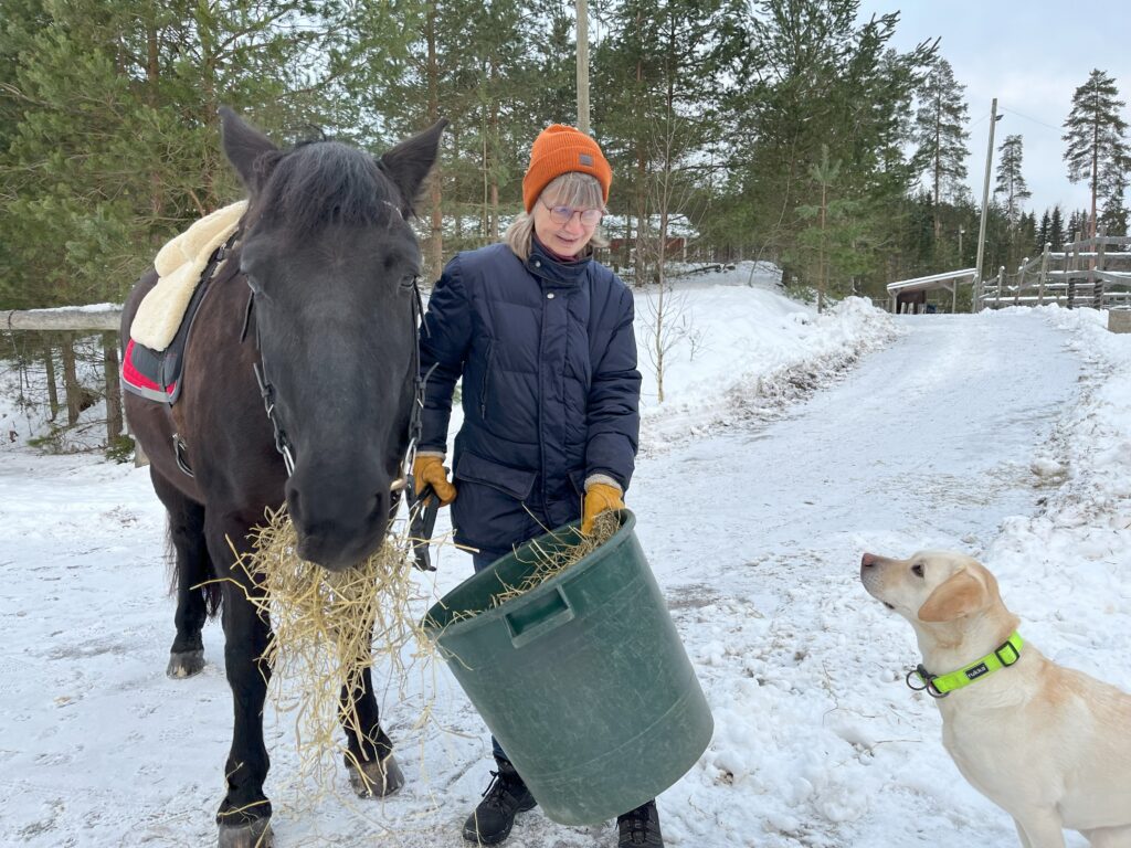 Suomenhevonen odottaa tallilla, vierellä kulkee nuori avustajakoira Elli ja kanalassa kotkottavat vanhat kanat, eläkkeellä kuten emäntänsäkin.